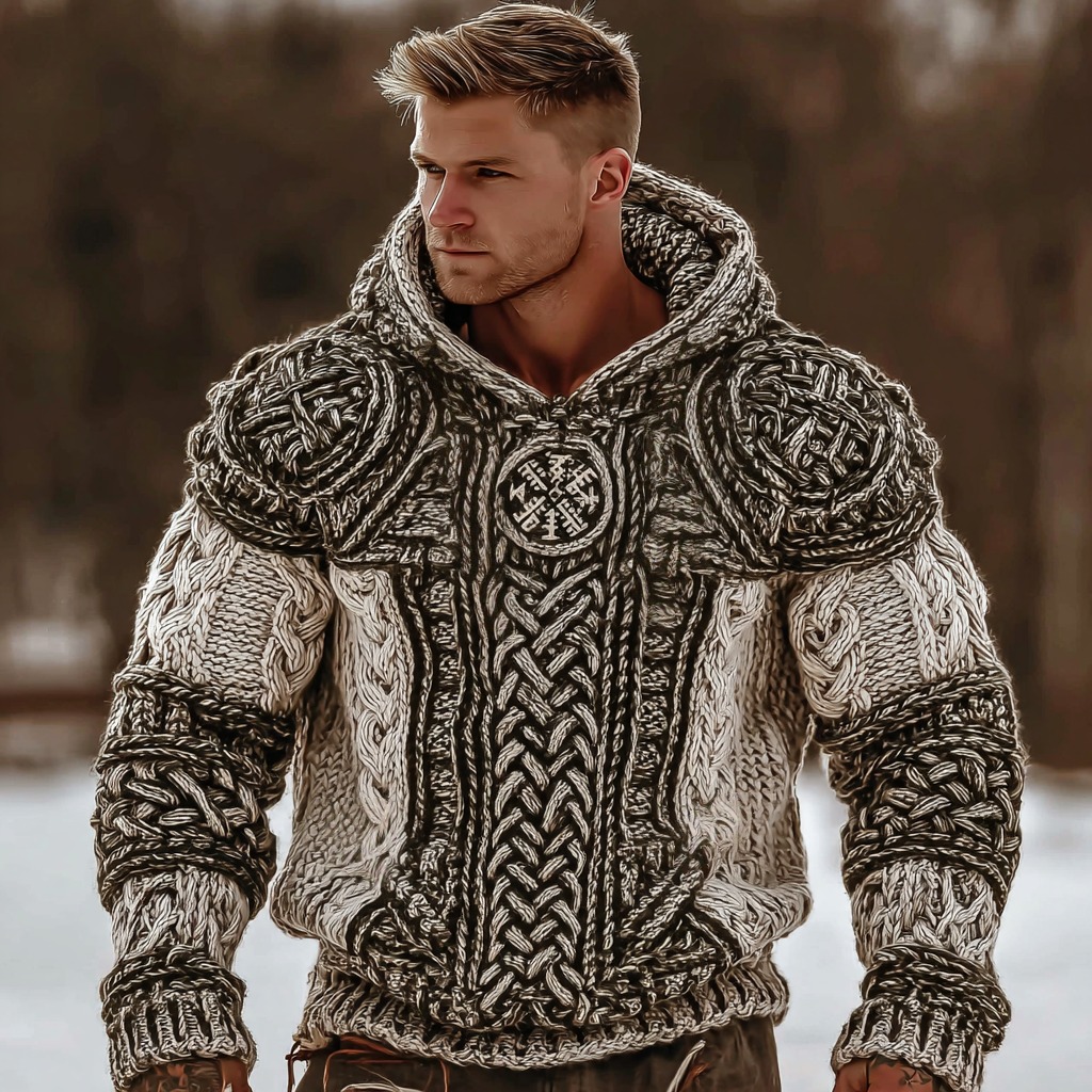 Men's Vintage Viking Rune Jacquard Hooded Sweater