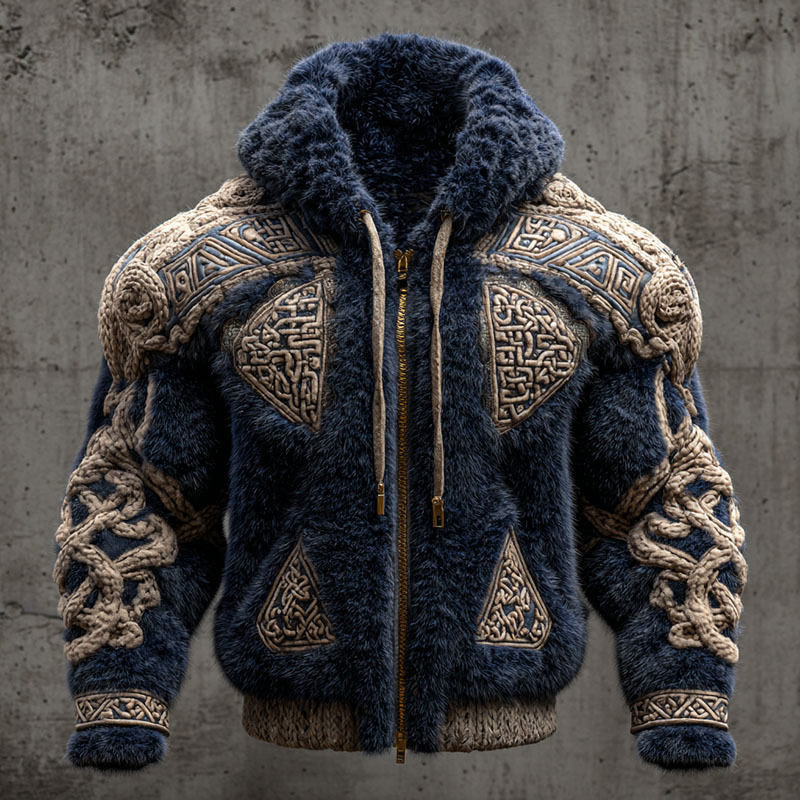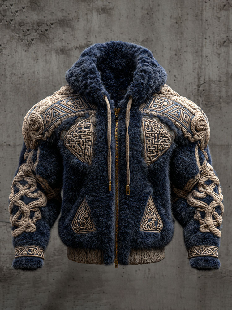 Men's Vintage Viking Tribal Jacquard Celtic Inspired Art Plush Warm Zip-up Hoodie