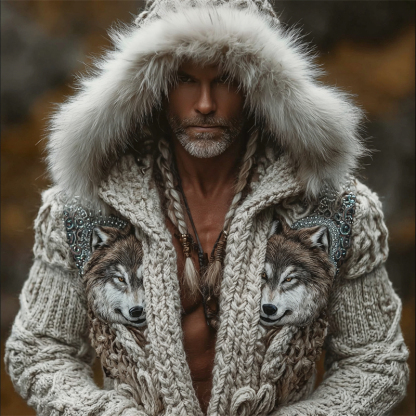 Men's Vintage Wolf Viking Fur Trim Hooded Chunky Cardigan