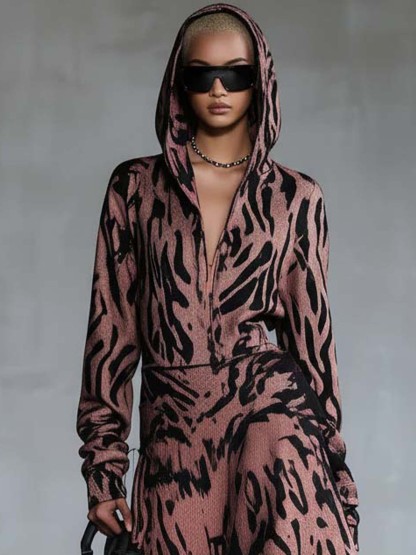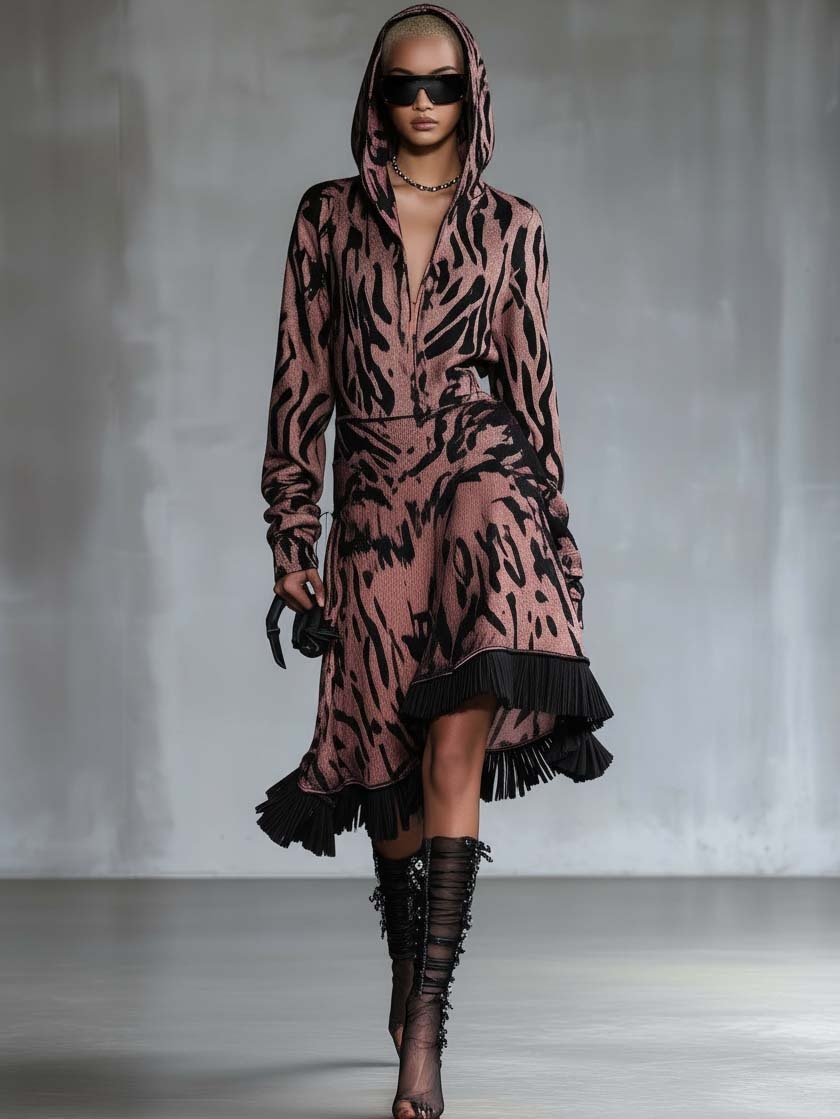 Pink Hooded Sweatshirt Midi Dress With Ruffles And Print