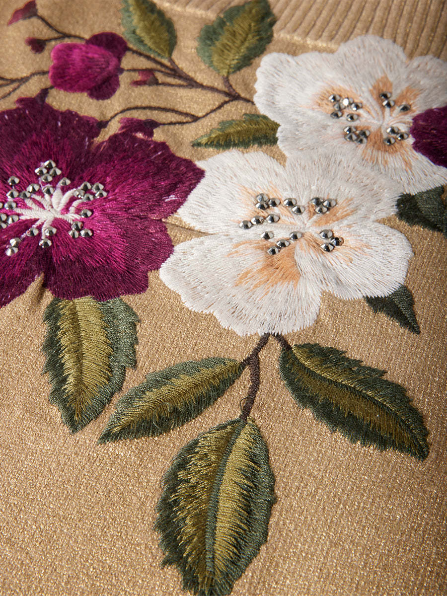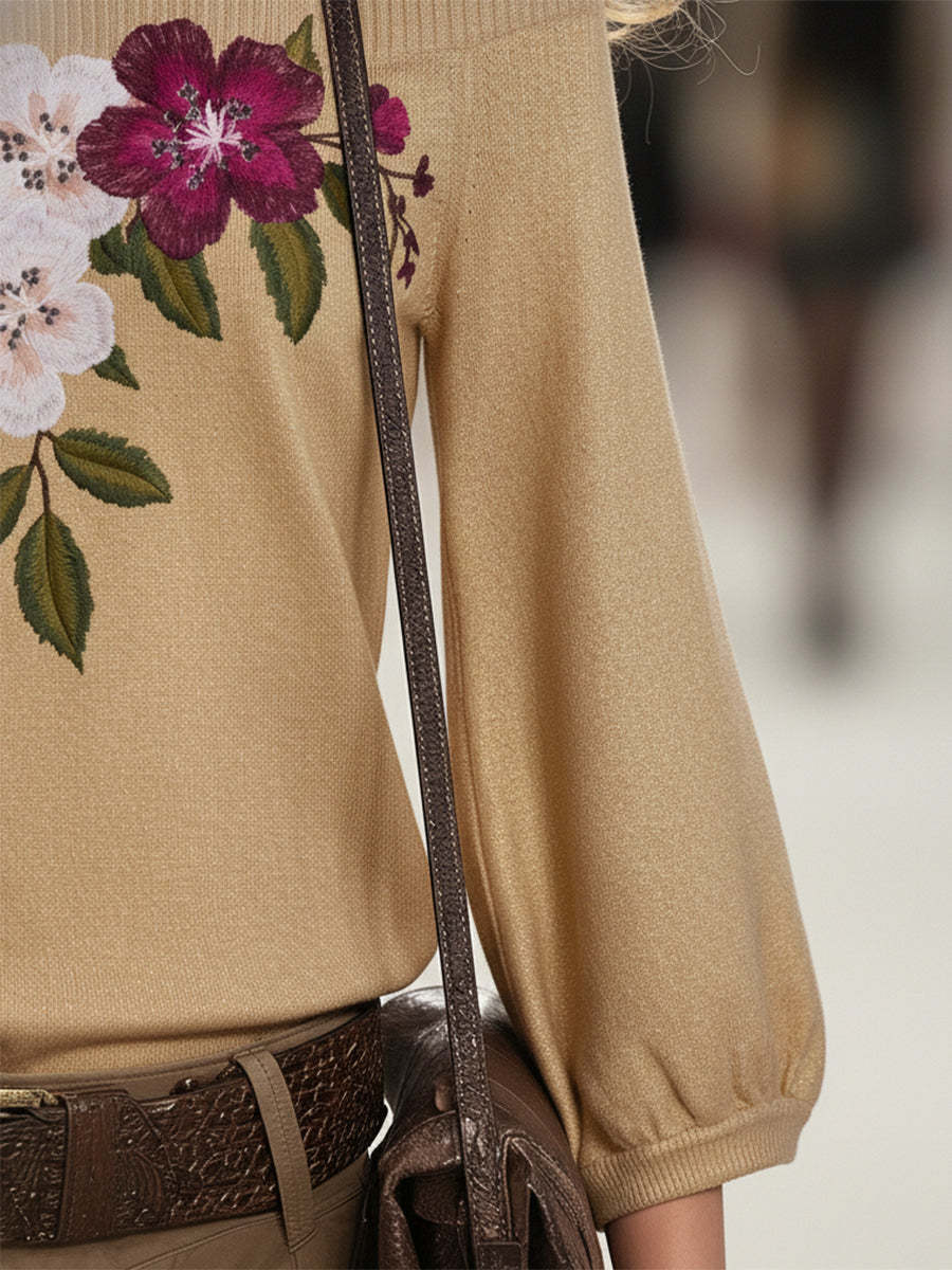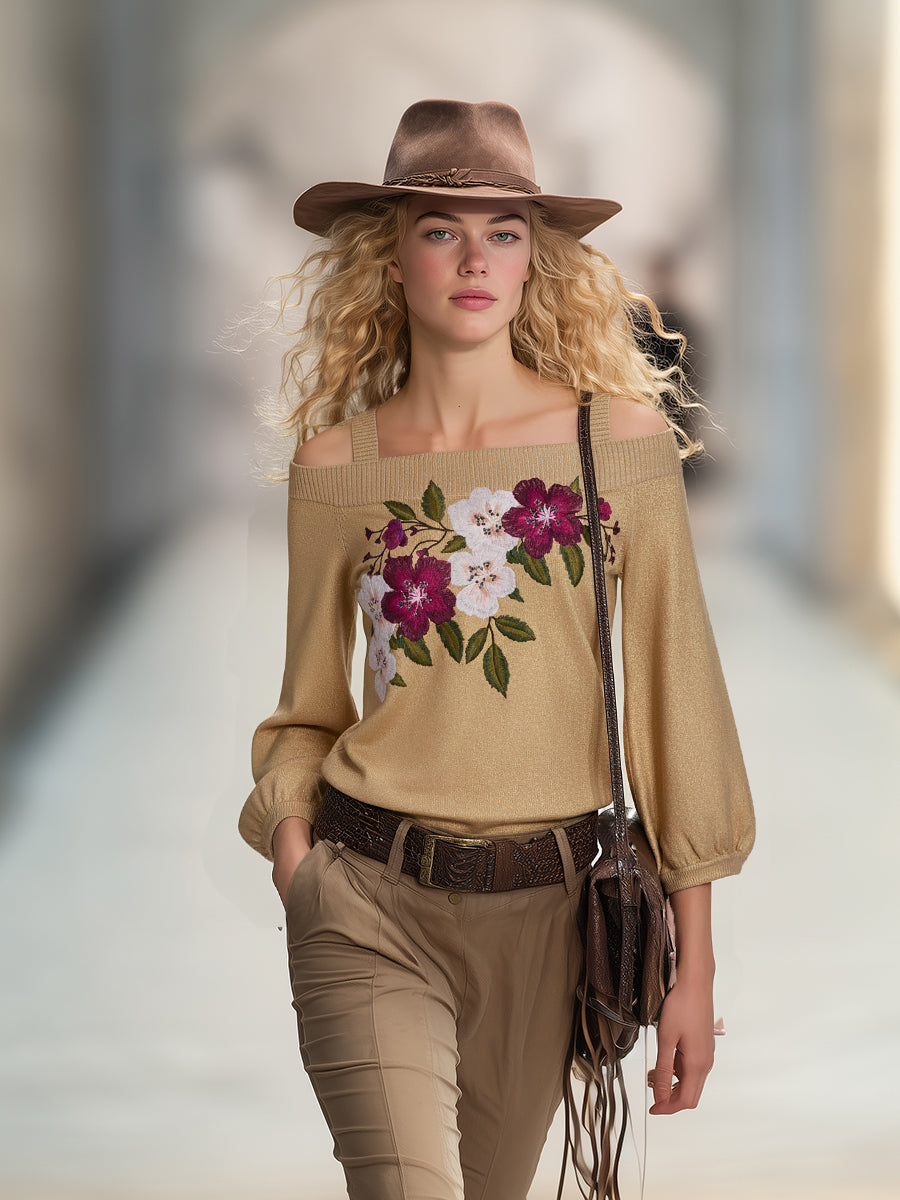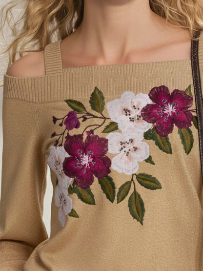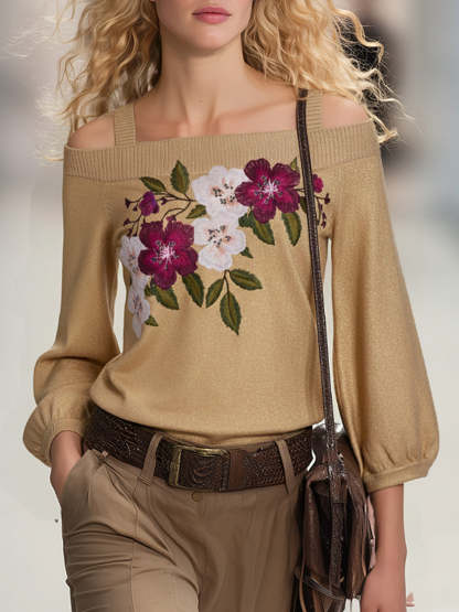 Retro-chic Floral Embroidered Off-shoulder Khaki Knit Sweater