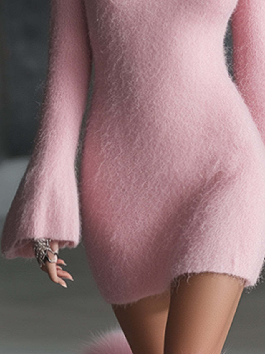 Romantic Square Neck Button Bell Sleeve Pink Seahorse Knit Mini Dress