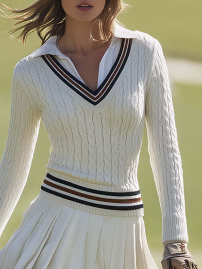 Sporty Retro Long-Sleeved Off-White Knit Cable Knit Sweater And Pleated Skirt Set