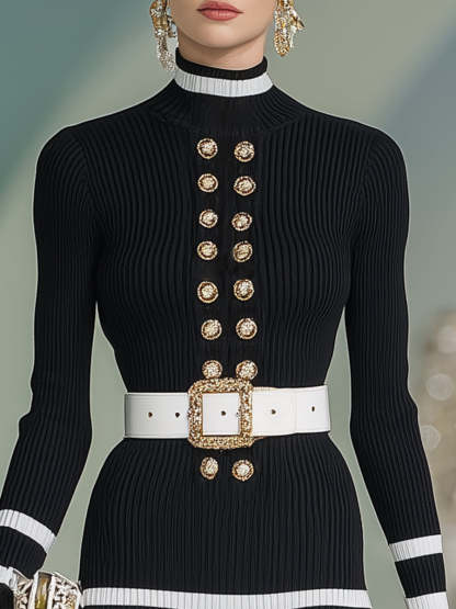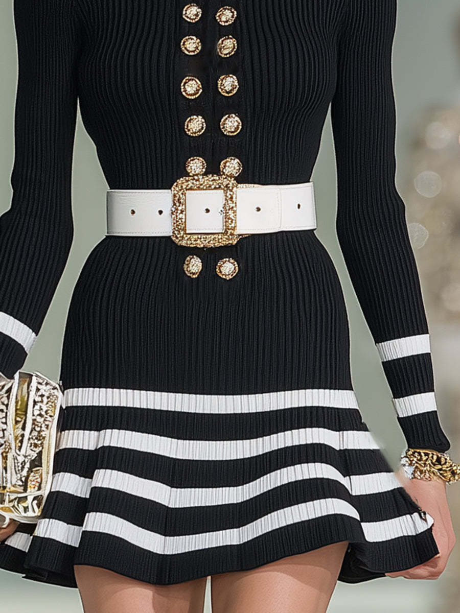 Stylish And Elegant High-neck Double-breasted Black And White Striped Knit Mini Dress
