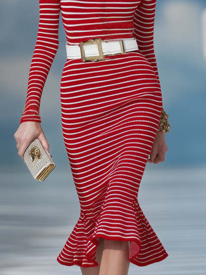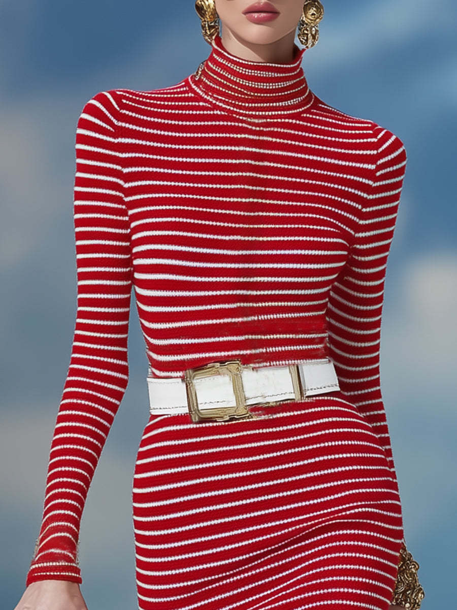 Stylish And Elegant Red And White Striped Turtleneck Fishtail Knit Midi Dress