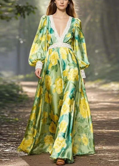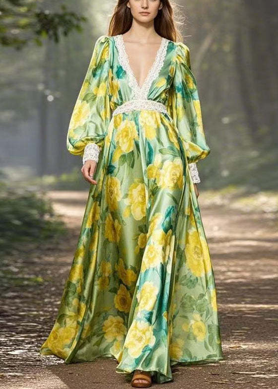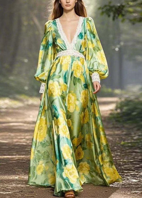 Stylish Green Print Patchwork Silk Maxi Dress V Neck Spring