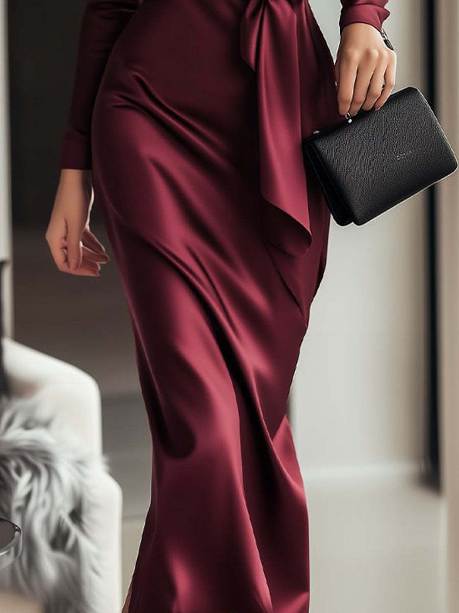 Timeless Burgundy Satin Wrap Dress with Waist Tie Detail