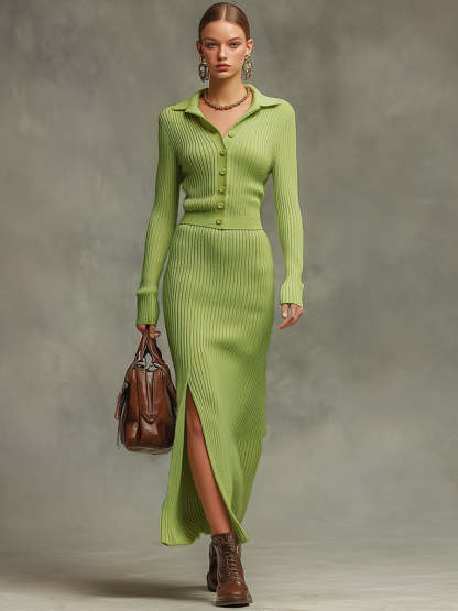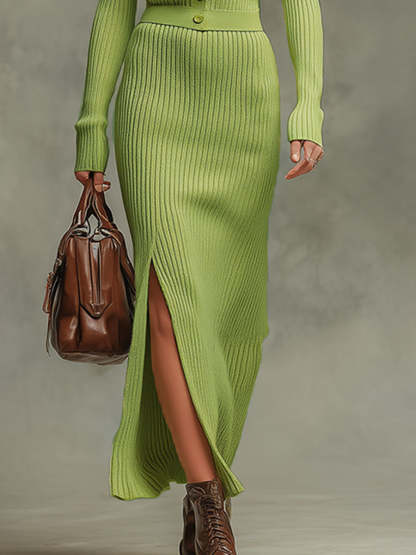 Trendy Retro Yellow-green Long-sleeved Knit Cardigan And Slit Skirt Set
