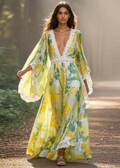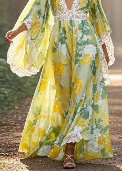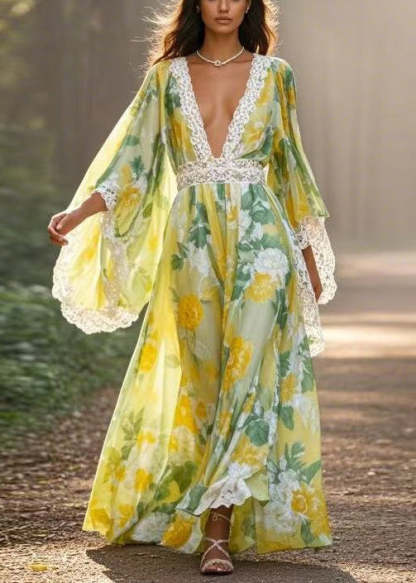 Unique Green Print High Waist Patchwork Chiffon Long Dresses Spring
