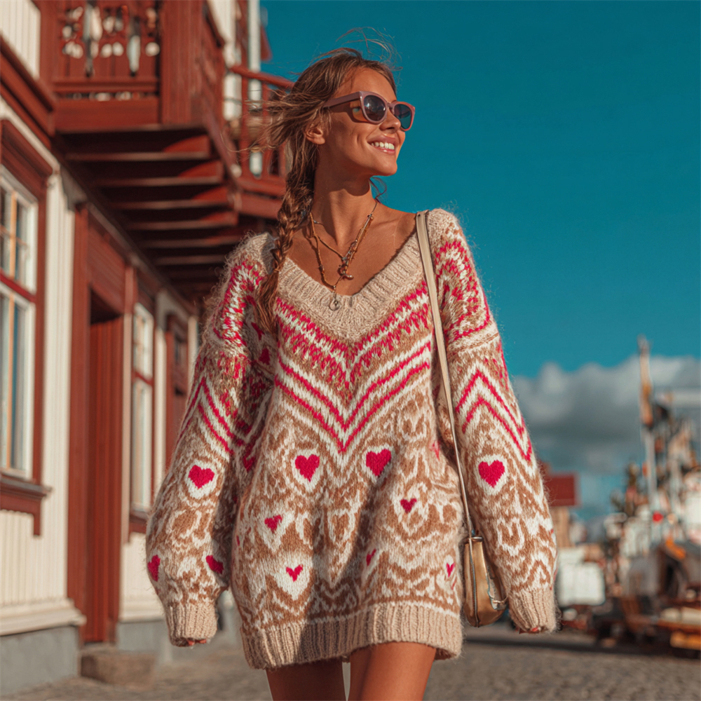 Valentine's Day Love Stripe Pattern Women's V-neck Icelandic Sweater Dress