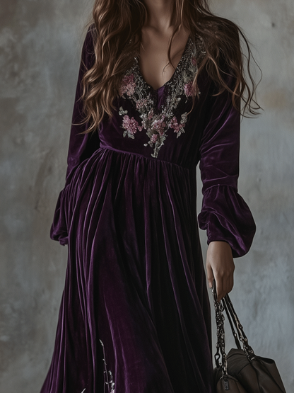 Vintage Floral Embroidered Velvet Maxi Dress