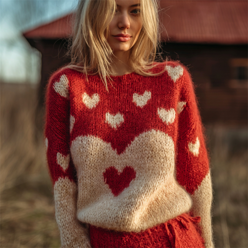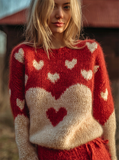 Vintage Valentine's Day Heart Contrast Cozy Knit Sweater