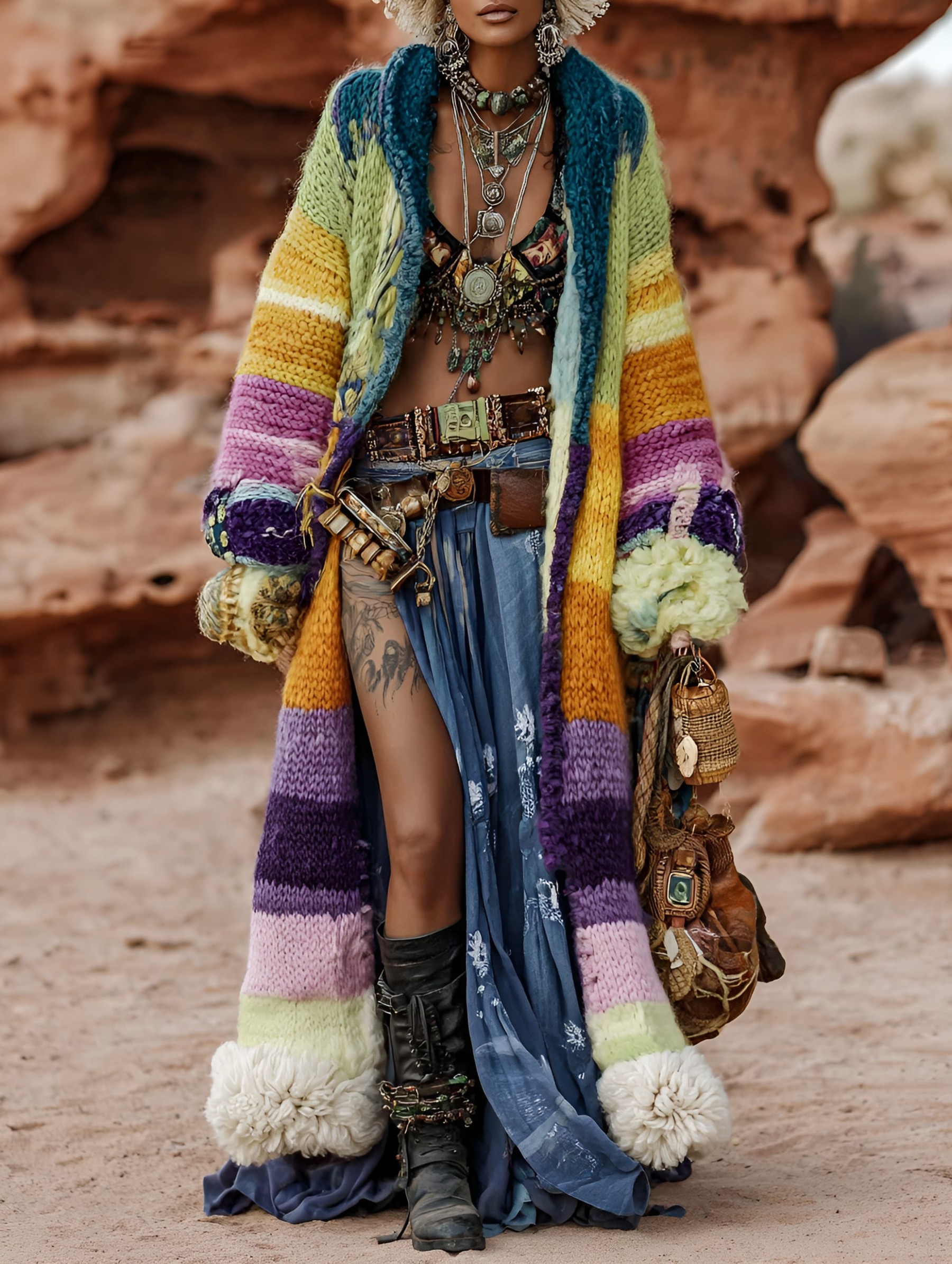 Women's Bohemian color patchwork pattern knitted cardigan