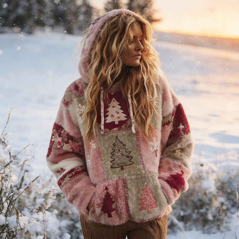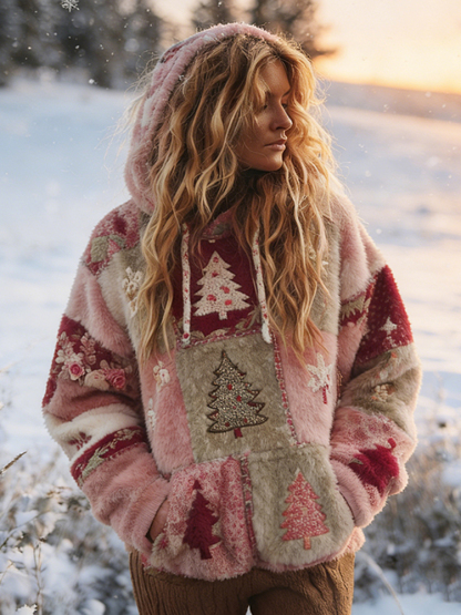 Women's Patchwork Floral Christmas Tree Print Plush Hoodie